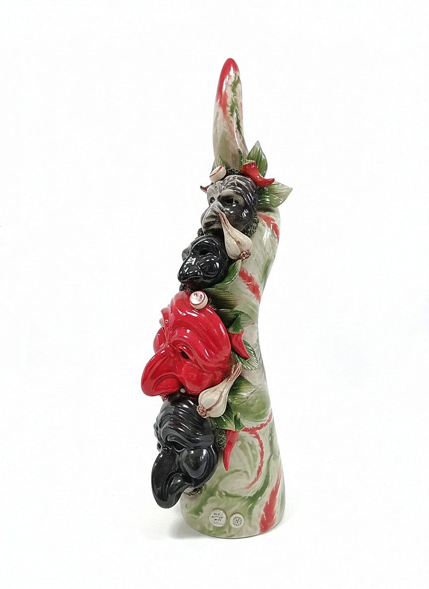 Simboli Antica Scaramanzia: L'aglio candido e i peperoncini rossi vibranti completano il potente messaggio augurale di questo capolavoro. Questa creazione è pensata per chi non si accontenta di un souvenir comune. È un complemento d'arredo esclusivo che cattura lo sguardo, perfetto per proteggere la casa o l'ufficio con eleganza. La lucentezza della ceramica di Capodimonte e la vivacità dei colori rendono ogni pezzo unico e irripetibile.